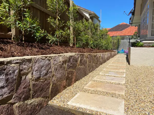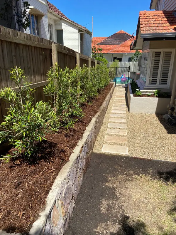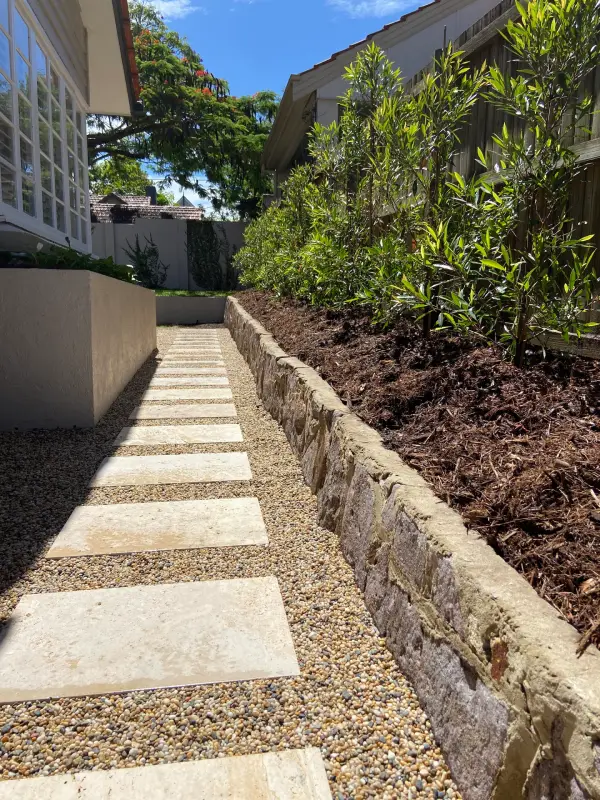 We simplified the side access to the pool area at this property in Ascot. Initially, it was overgrown with outdated paving. Our team installed Classic Travertine stepping stones, surrounded by 10mm Nambucca Heads pebbles, and the paved area is contained with Shapescaper Corten steel edging. The planting was simple but elegant, featuring Elaeocarpus reticulatus (Blueberry Ash) along the boundary line and Zantedeschia aethiopica (Arum Lilies) along the window sill.