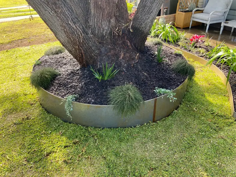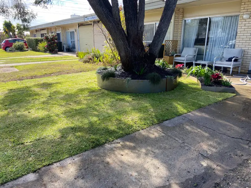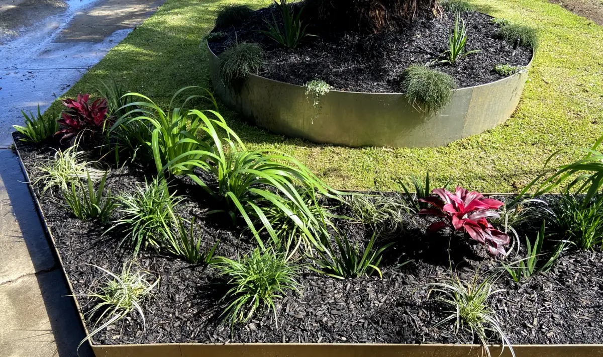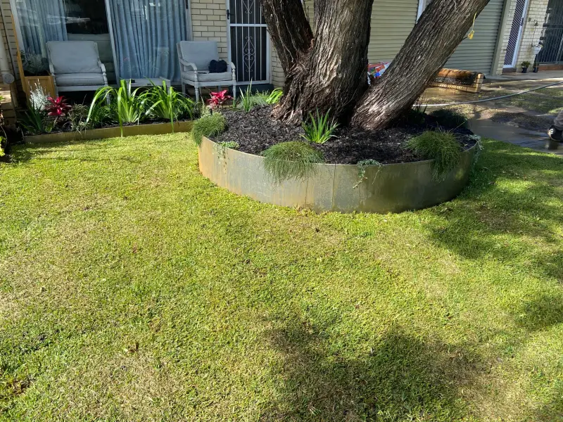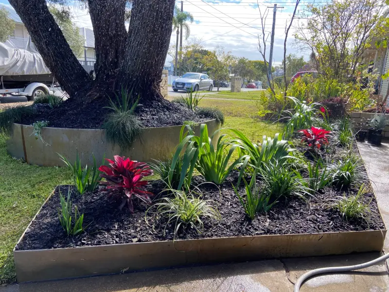 A quick and simple makeover at this property at Bulimba. The team used Corten steel garden edging for the tree ring and garden bed. Sir Walter Buffalo turf was laid for the lawn. Hardy, yet colourful plants which provide impact were chosen for the garden beds.