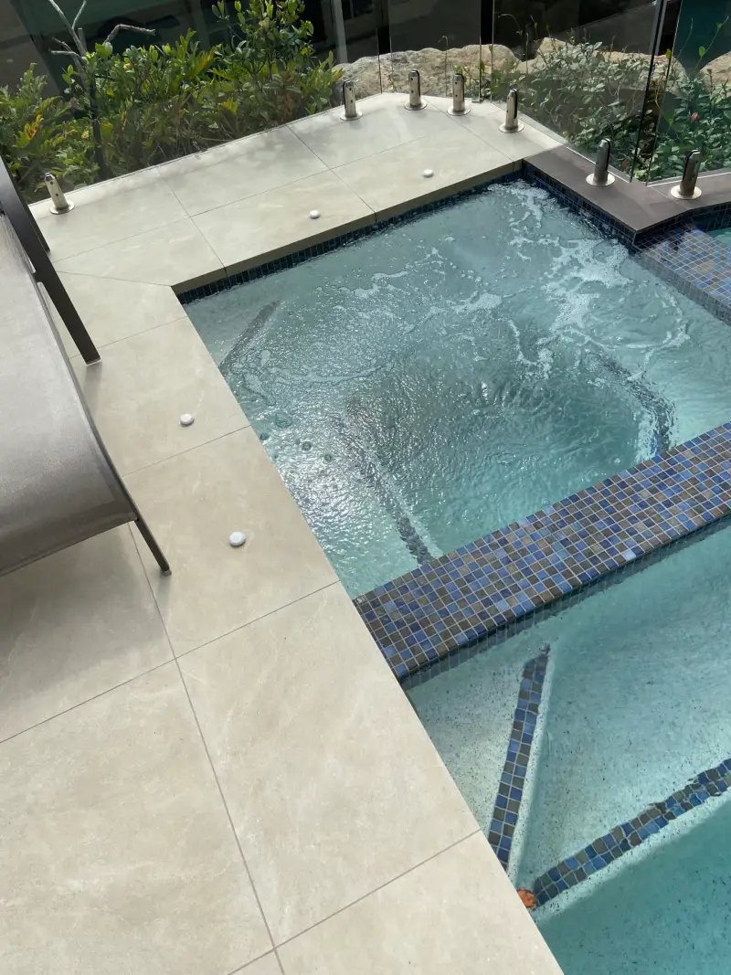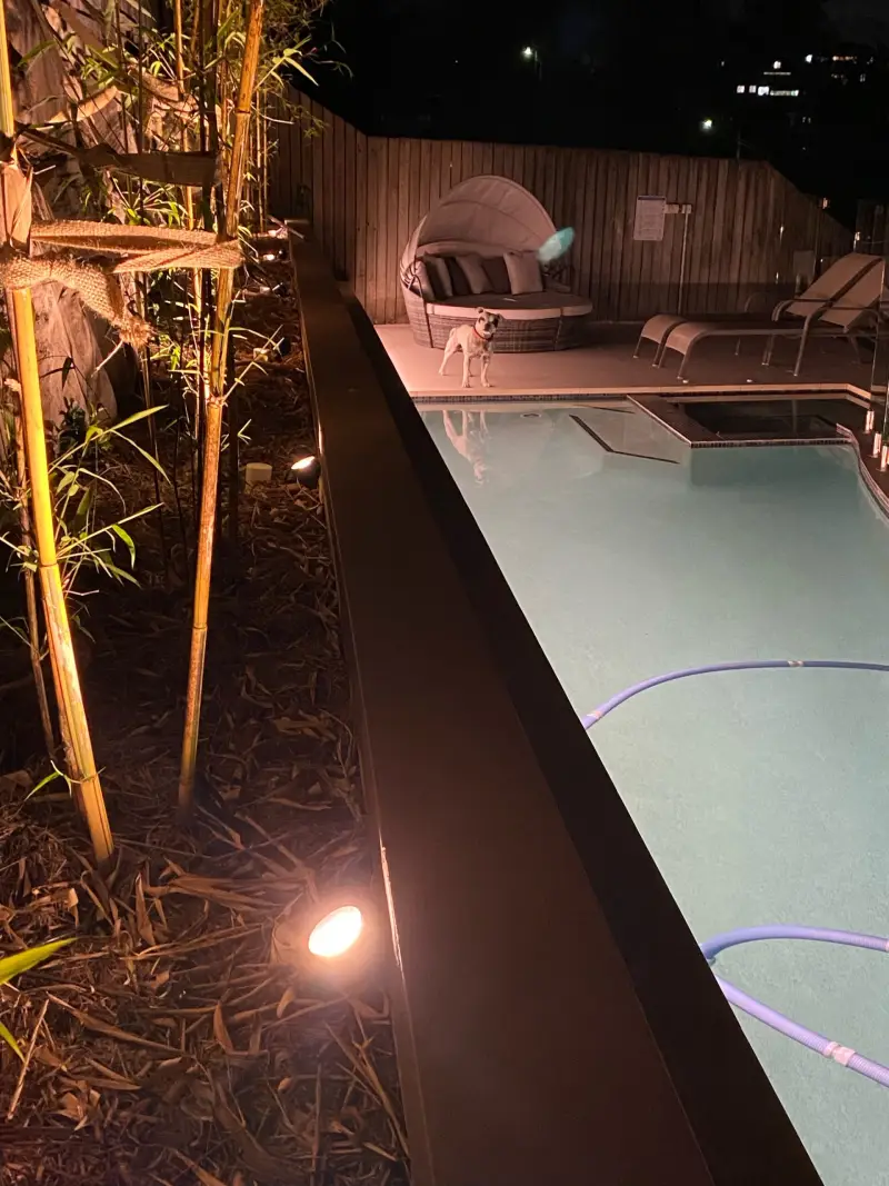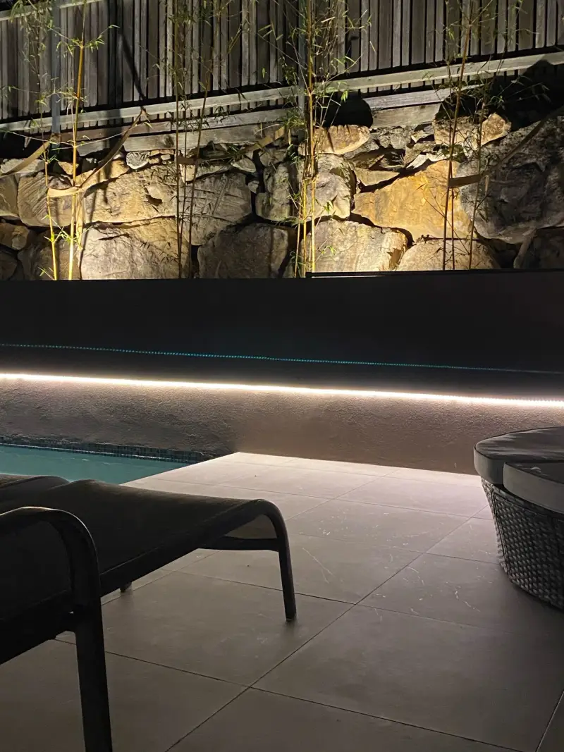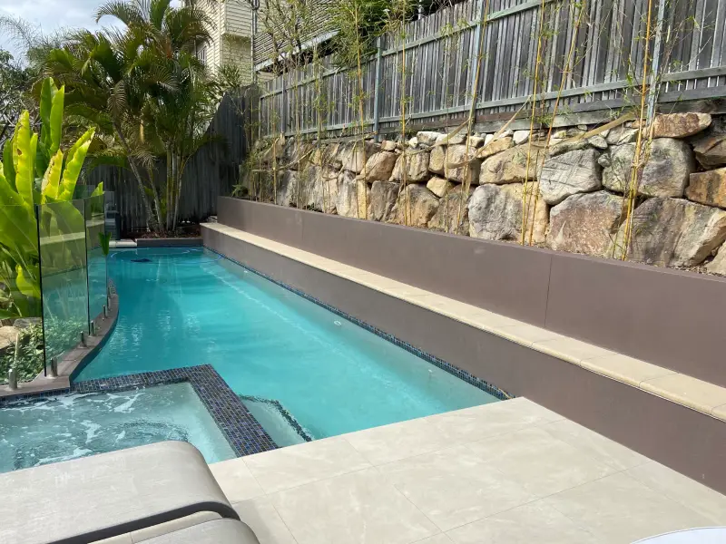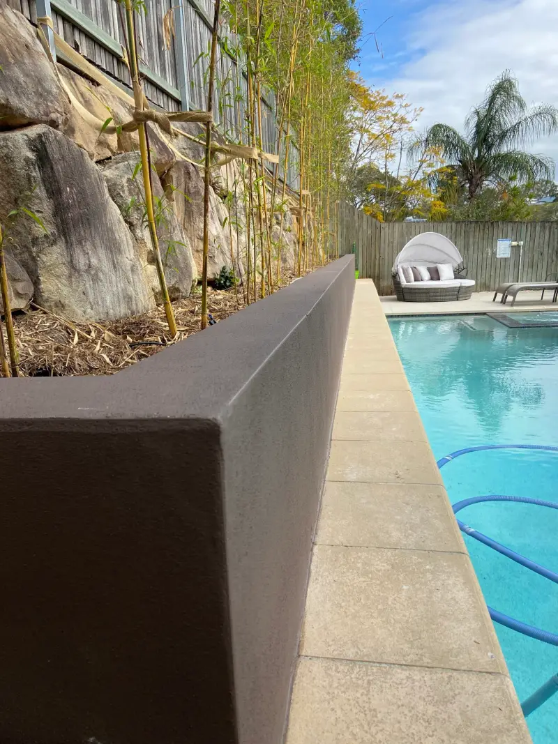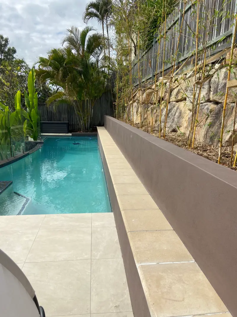 The team worked really hard on this project at Seven Hills. Access was extremely challenging with all materials having to be taken up via hand as we could not get a wheelbarrow to the top. We completed this 15m x 600mm high rendered and painted block retaining wall, tiling of the pool surrounds, lighting and importation of premium soil mix to contain Bambusa eutuldoides ‘China Gold Bamboo’ as the plant selection to screen out the neighbours above the property.